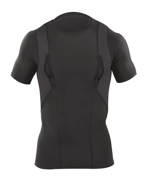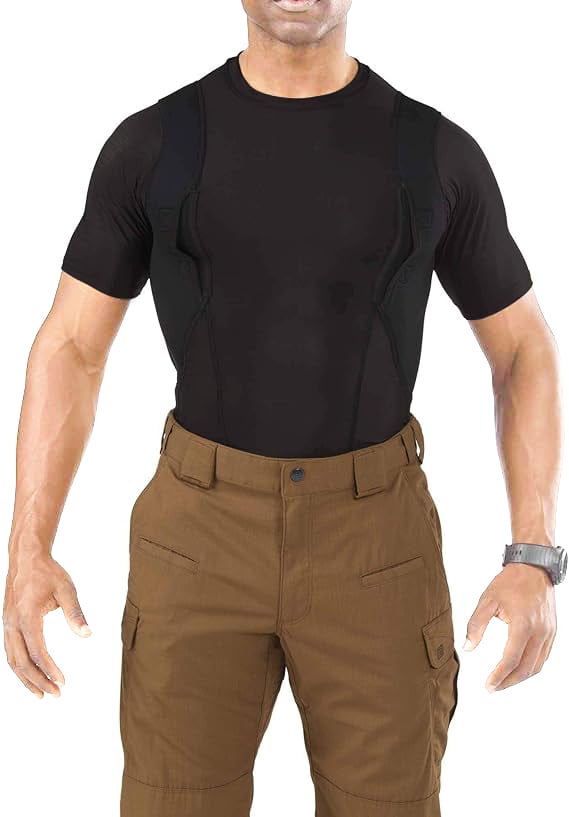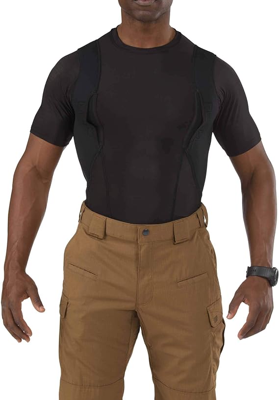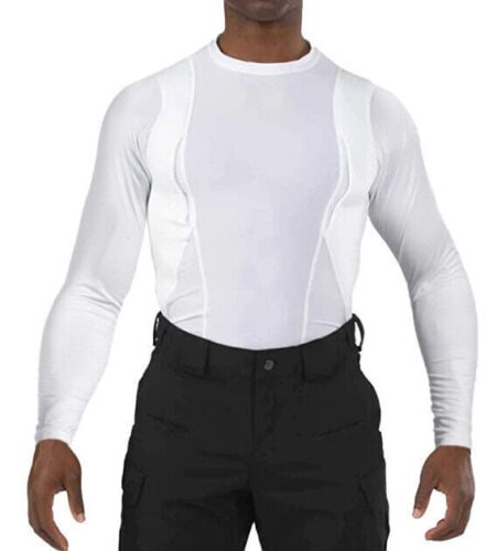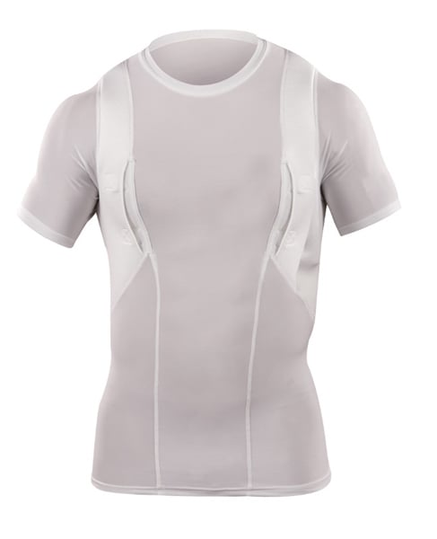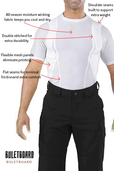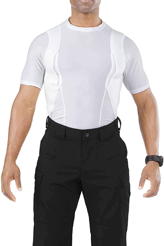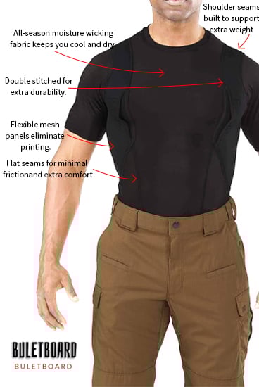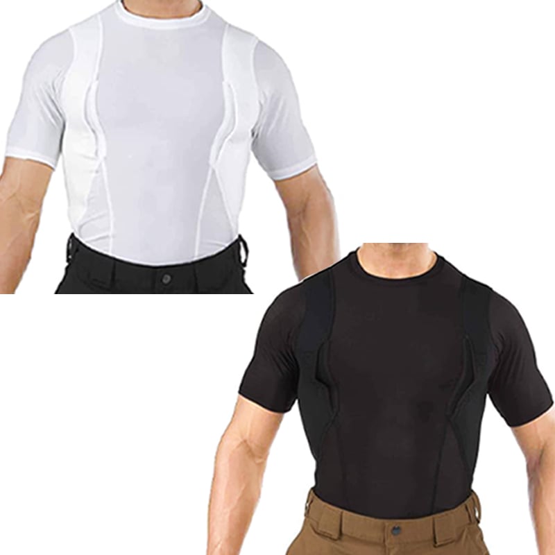 The holster is compatible with most handguns and features a secure retention system to keep your firearm in place. Padded mesh layers eliminate sagging, and obscure the profile of your pistol or revolver under just about any clothing. Plenty of extra space for magazines, phones, small electronics, pepper spray, LVAD, or other personal gear for use in sports, undercover, police, military, combat, assault, and covert applications! Short sleeve tee shirt style LOOKS AND FEELS GREAT, indoors or out, under your button-down shirt, t-shirt, or pullover!